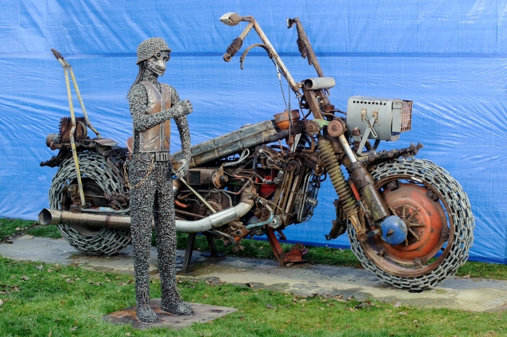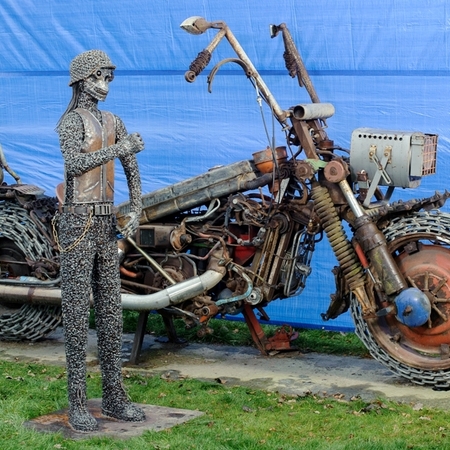 Šalia didžiausio motociklo stovi ir iš varžtų suvirinta metalinio baikerio skulptūra.