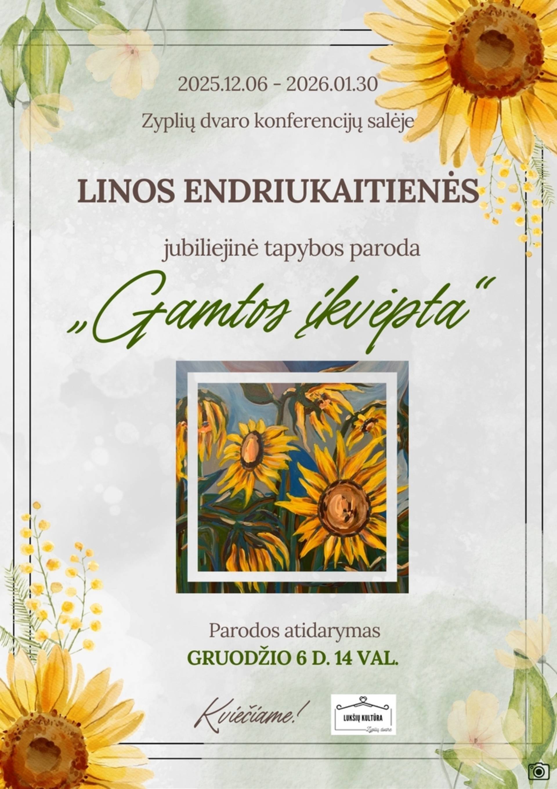 Gruodžio 6 d. 14 val. Zyplių dvaro konferencijų salėje atidaroma Linos Endriukaitienės jubiliejinė tapybos paroda „Gamtos įkvėpta“. 🎨