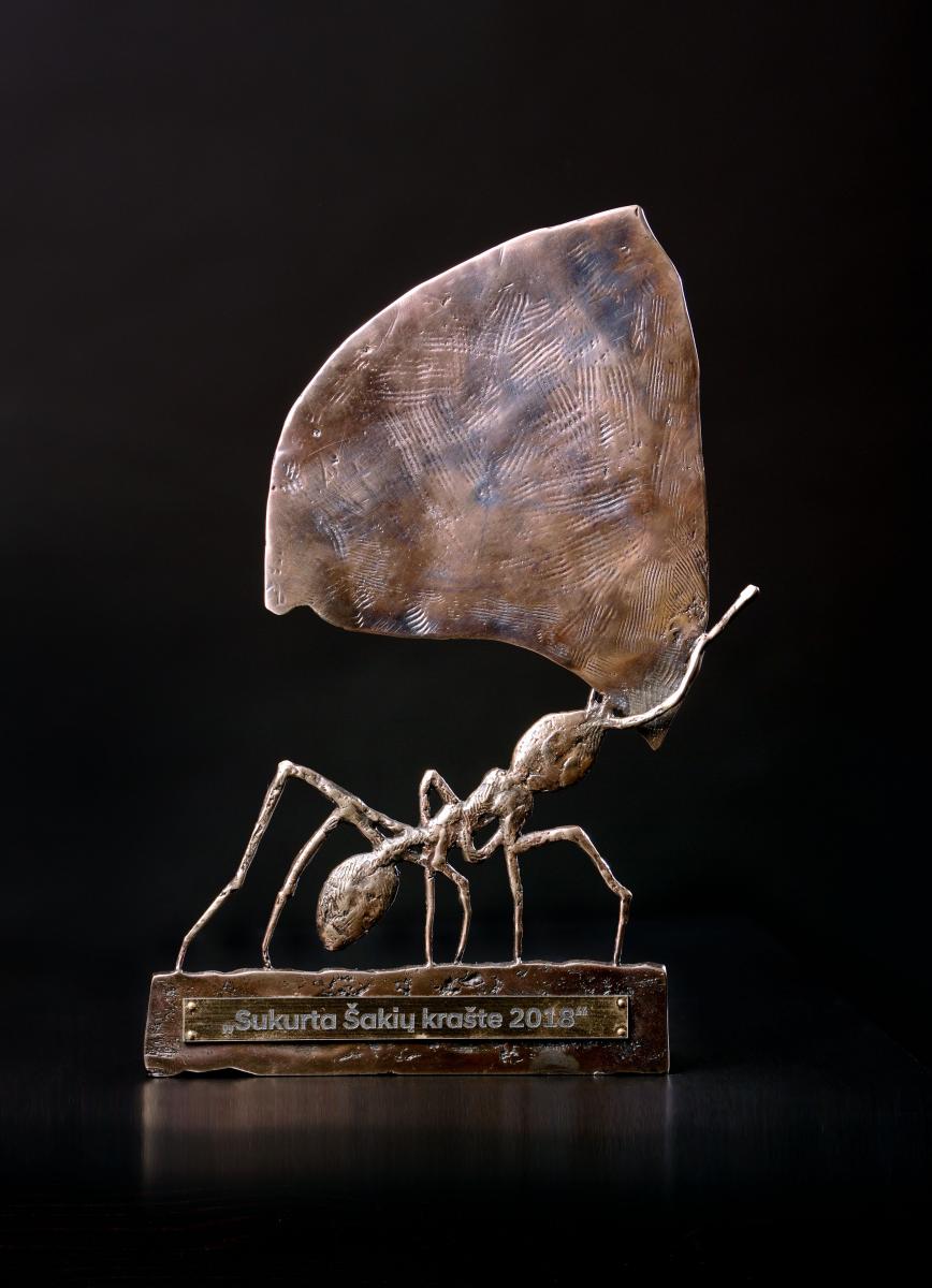 Nugalėtojas apdovanojamas skulptoriaus Kęstučio Dovydaičio kurtą Verslo skruzde.