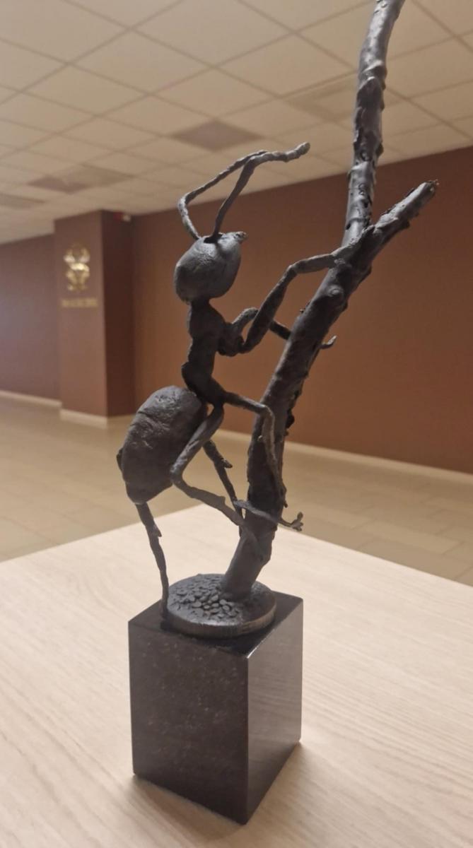 Nugalėtojas apdovanojamas skulptoriaus Kęstučio Dovydaičio kurtą Verslo skruzde.